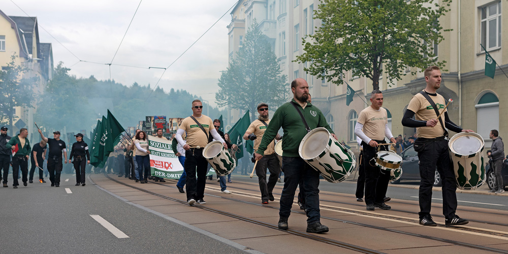 In Plauen ist auch Karl-Heinz Statzberger aus München, ein seit vielen Jahren umtriebiger rechtsextremer Aktivist und Chef des hiesigen lokalen Ablegers des „III. Wegs“, mit dabei. An seinem Beispiel zeigt sich, wie eng rechtsextreme Ideologie und Gewaltbereitschaft zusammenhängen – ein gerade mit Blick auf den „III. Weg“ beunruhigender Zusammenhang. Statzberger wurde 2005 wegen der Planung eines Sprengstoffanschlages auf die Grundsteinlegung des jüdischen Zentrums in München zu einer mehrjährigen Gefängnisstrafe verurteilt. Damals war er noch Mitglied der Kameradschaft München-Nord, anschließend wichtiger Akteur im neonazistischen und seit 2014 verbotenem „Freien Netz Süd“ (FNS) und heute führendes Mitglied des „III. Wegs“ in München und Umgebung.