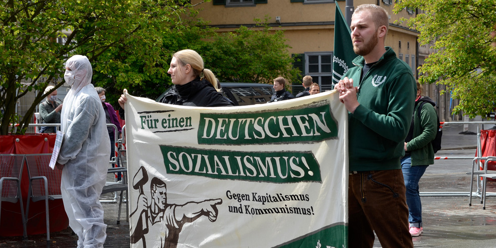 „Frei, sozial und national!“ Diese und weitere Parolen wie „Deutscher Sozialismus – Jetzt!“ rufen die Anhänger*innen der neonazistischen Partei „Der III. Weg“ auf ihren martialisch inszenierten Aufmärschen und stellen damit einen direkten Bezug zum historischen Nationalsozialismus her. Zuletzt war eine solche öffentliche Machtdemonstration vor Beginn der Corona-Pandemie am 1. Mai 2019 im vogtländischen Plauen zu sehen, als hunderte gleichgekleidete und in Reih und Glied marschierende Demonstrationsteilnehmende dem Nationalsozialismus huldigten. Kaum eine Gruppierung trägt die Verehrung der NS-Zeit so eindeutig zur Schau wie „Der III. Weg“. In Bayern ist er die aktivste neonazistische Organisation.