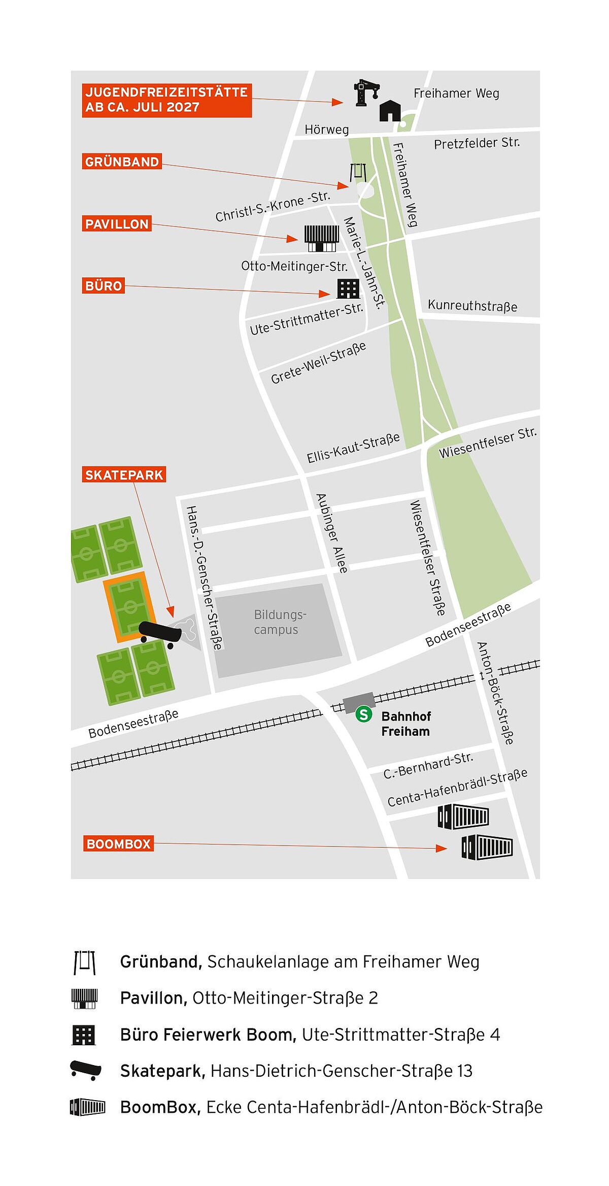 Unsere mobilen Aktionen im Viertel finden an verschiedenen Standorten statt. Zu diesen gehören aktuell (ja nach Bedarfen kann sich das bei einem mobilen Vorlaufprojekt immer wieder ändern) die BoomBox, der Skatepark, das Grünband, der Pavillon oder auch das Boom Büro in der Ute-Strittmatter-Str 4. An allen Standorten gibt es jede Menge kreativ-sportlich-musikalische Angebote für Kinder und Jugendliche ab 10 Jahren. Damit ihr euch zurechtfindet, werft gerne einen Blick auf unseren Lageplan:
