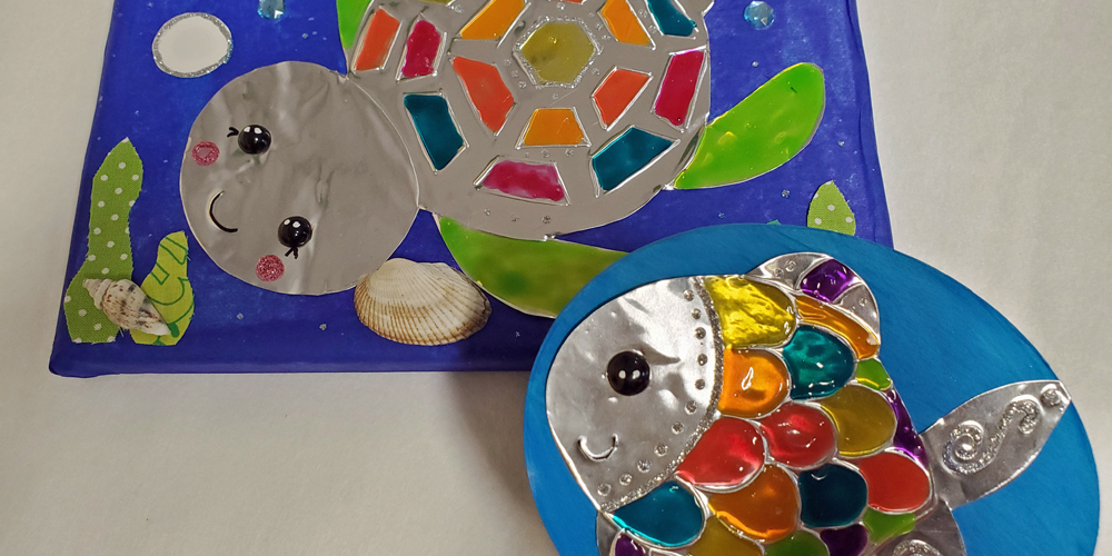 In die silberne oder goldene Aluprägefolie lässt sich ganz einfach mit einem Bleistift ein Muster eindrücken. Dies sorgt für einen besonderen dreidimensionalen Effekt. Bemalt werden kann die Folie mit Window Color. Mit der so gestalteten Prägefolie lassen sich kleine Schachteln, Bilder auf Leinwänden oder auch Klangspiele gestalten.