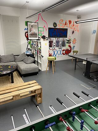 Hier könnt ihr Freund*innen treffen und abhängen, kickern oder sporteln. Sagt uns, was ihr cool findet und wir setzen es dann gemeinsam in die Tat um. Im Jugendraum gibt es eine Xbox, einen Jonglage-Koffer, eine Musikanlage und viel Platz für eure Themen und Projekte. Es liegt an euch, was daraus zu machen.