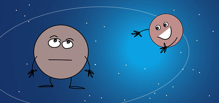 Pluto wird immer von seinem Mond Charon begleitet. Manchmal hätte er aber gerne seine Ruhe. Warum der Mond immer an seiner Seite bleibt, erklärt ihm Benjamin Mirwald aus der Volkssternwarte.