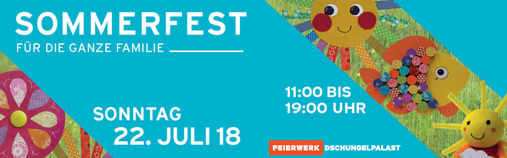 Es ist Sommer, die schönste Zeit des Jahres! Und das bedeutet nicht nur Sonne, Eis und Baden, sondern auch, dass der Feierwerk Dschungelpalast endlich wieder zum großen Sommerfest einlädt! Am Sonntag, den 22.07.2018 gibt es von 11:00 bis 19:00 Uhr für Klein und Groß ein kunterbuntes Programm aus Live-Musik, Theater, Kreativität, Spiel- und Sportangeboten sowie kulinarischen Leckereien im gemütlichen Biergarten – und das alles bei freiem Eintritt!