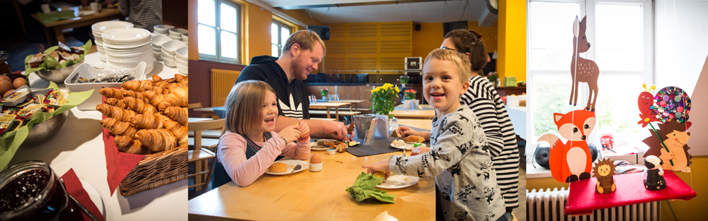 Das reichhaltige Buffet lässt mit frischen Backwaren, Müsli, Cornflakes und frischem Obst, hausgemachten Salaten, Eiergerichten, vielfältigen Käse- und Wurstplatten, Wienern sowie Kuchen und Croissants nichts missen, was zu einem abwechslungsreichen Frühstück für die ganze Familie gehört. Zur Begrüßung stehen ein Glas Prosecco oder Orangensaft zur Auswahl. Extra für die Kinder gibt es MiniBrezn, Mini-Semmeln und Mini-Muffins.