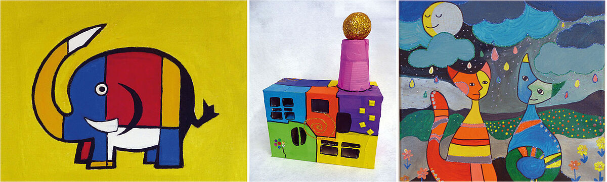 Zu allen Künstler*innen gibt es für die Kinder Anschauungsmaterial. Erst einmal können sie sich zur Inspiration eine Zusammenstellung von Postkarten ansehen und in verschiedenen Kunstbüchern blättern. Vorbereitete Schablonen helfen, die einmaligen künstlerischen Formen zu skizzieren und dann mit Acrylfarben richtig loszulegen. Zum fantasievollen Gestalten ihrer Bilder können die Kinder aber auch Mosaiksteine, Glitzersteine, verschiedene bunte Stoffe, Papiere und alle möglichen Materialien nutzen. Sogar gesammelte Becher, Dosen oder Kartons lassen sich kreativ upcyceln und in farbenfrohe Hausmodelle im Stil von Friedensreich Hundertwasser verwandeln.