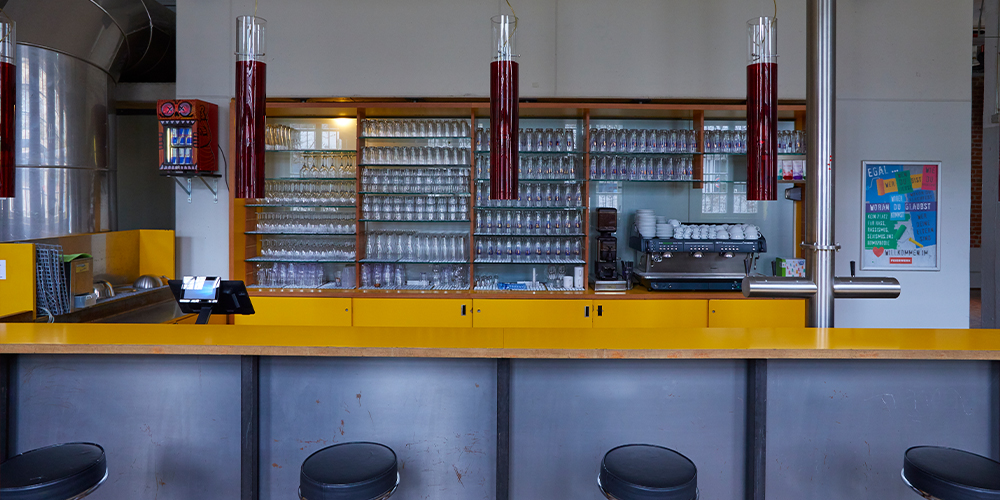 Direkt angeschlossen befinden sich ein Café (100 m²) mit stilvoller Bar, eine voll ausgestattete Küche sowie eine zusätzlich nutzbare Außenfläche mit Biergartenatmosphäre. Beides lässt sich perfekt mit Veranstaltungen in der Kranhalle kombinieren. Das Café kann auch separat gemietet werden.